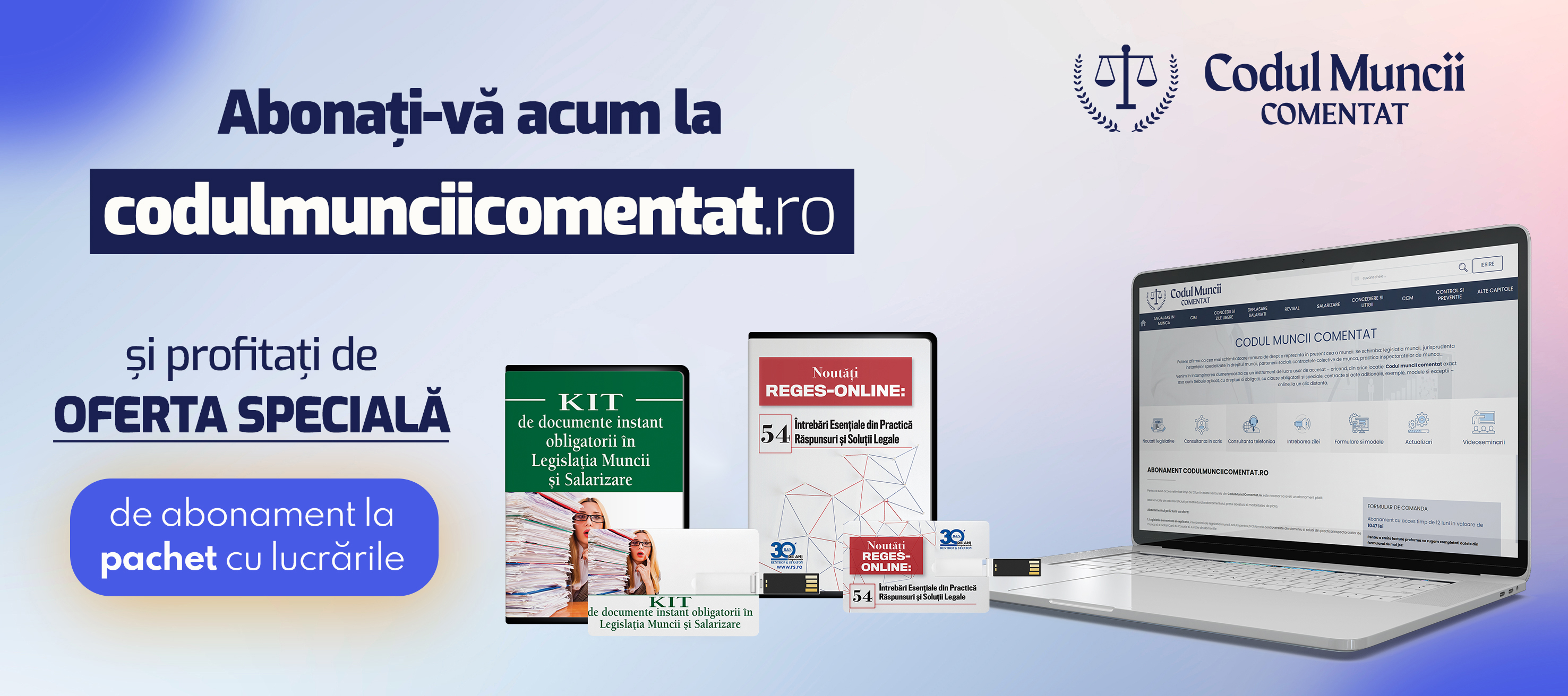 OFERTA SPECIALA! Pachetul format din abonamentul pe 3 luni la CodulMunciiComentat.ro cu toate serviciile incluse + lucrarile „Kit de documente obligatorii in Legislatia muncii si Salarizare” si „Noutati REGES-ONLINE. 54 de intrebari esentiale din practica. Raspunsuri si solutii legale” va este oferit acum la pretul special de numai: 440 lei + 11% TVA, fata de 774 lei + TVA!